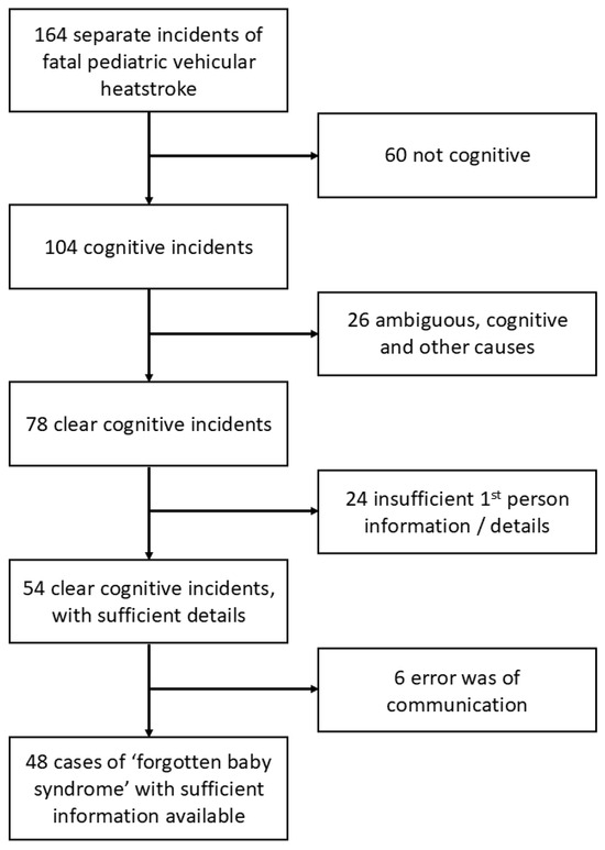 We examined all cases of fatal pediatric vehicular heatstroke over a five-year period in the USA (2019–2023), as listed on two public websites, Kids and Car Safety (https://www.kidsandcars.org/ accessed on 20 January 2024) and No Heat Stroke (https://www.noheatstroke.org accessed on 20 January 2024). We also conducted additional searches to check for any cases not listed on either site but reported in the media. This resulted in over 300 news reports being analyzed. In total, 164 incidents were identified and examined, involving 166 child fatalities. However, 60 incidents did not appear to involve a cognitive error by the driver; in these incidents, the driver deliberately left children within the vehicle, or children gained access to the interior of parked vehicles and became trapped, or there was insufficient information to determine the context of the incident. This left 104 incidents in which cognitive errors were possible or probable important factors in the events leading to fatal heatstroke. However, 26 cases were ambiguous (e.g., the child could have been either intentionally left in the vehicle, or they could have been forgotten). Thus, we excluded those 26 incidents and focused our analysis on the 78 that appeared to be clear cases of cognitive error by the driver.
