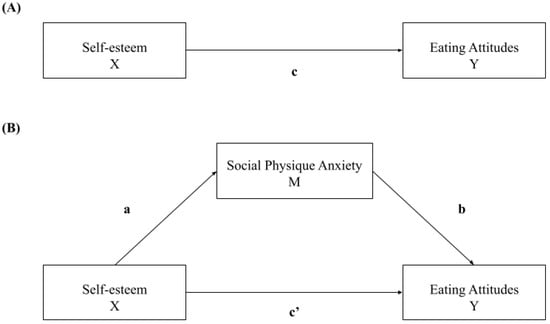 Hypothesized model with social physique anxiety as the mediator between self-esteem and eating attitudes. (A) Total effect of self-esteem on eating attitudes (path c); (B) mediation model showing path a (self-esteem → social physique anxiety), path b (social physique anxiety → eating attitudes), and the direct effect of self-esteem on eating attitudes after including mediator in the model (path c′). X: Independent variable; Y: Dependent variable; M: Mediator.