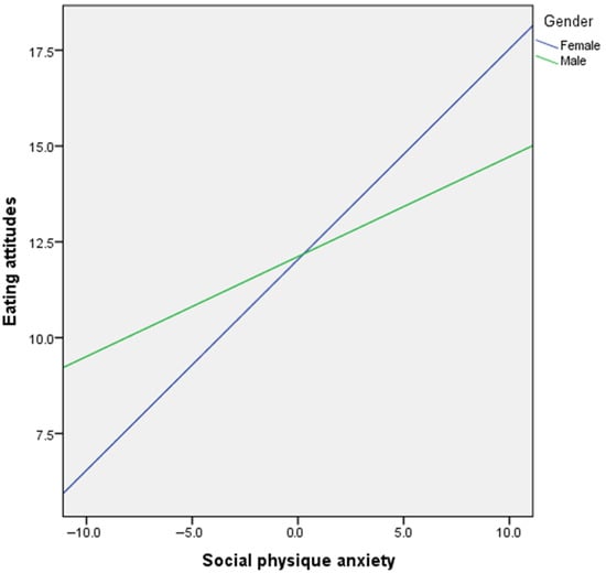 A moderated mediation analysis was conducted using Hayes’ Model 14, in which gender specifically moderates the association between social physique anxiety and eating attitudes. In this model (Table 5), self-esteem continued to negatively predict social physique anxiety (path a: b = −0.97, 95% CI [−1.11, −0.84]), and social physique anxiety positively predicted disordered eating attitudes (path b: b = 0.84, 95% CI [0.59, 1.09]). In addition, the conditional effect of social physique anxiety on eating attitudes was significant for both genders (conditional path b for males: b = 0.26, 95% CI [0.10, 0.42], conditional path b for females: b = 0.55, 95% CI [0.44, 0.66]). As illustrated in Figure 2, the effect was stronger for females. The interaction between social physique anxiety and gender was also significant (b = −0.29, 95% CI [−0.47, −0.11]). The direct effect of self-esteem on eating attitudes remained non-significant in the presence of social physique anxiety in the model (path c′: b = 0.07, 95% CI [−0.10, 0.23]). The conditional indirect effects of self-esteem on eating attitudes were significant for both genders. However, the effect was stronger among females (conditional indirect effect for males: b = −0.25, 95% CI [−0.45, −0.06], conditional indirect effect for females: b = −0.54, 95% CI [−0.69, −0.40]). The index of moderated mediation was significant (b = 0.28, 95% CI [0.07, 0.51]), indicating that the indirect effect of self-esteem on disordered eating attitudes through social physique anxiety varied as a function of gender.