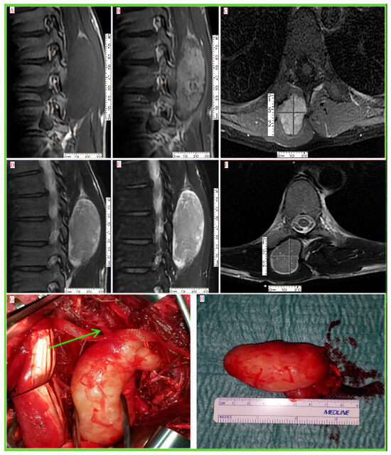 A 49-year-old male with several years of history of back pain was admitted to our center following severe worsening of his pain. Upon physical examination, a firm mobile mass was detected in the upper back region, with tenderness upon palpation. There were no motor or sensory deficits. Subsequent ultrasound and MRI were realized, revealing a well-delineated ovoid paravertebral mass extending from T7 to T9, measuring 80 × 28.4 × 20 mm (Figure 2). The lesion exhibited a heterogeneous hypointense signal on T1-weighted imaging, a hyperintense signal on T2-weighted imaging, and diffuse contrast enhancement on T1+C (Figure 2). Given the broad differential diagnosis for paraspinal lesions and the limitations of relying solely on radiologic findings, an ultrasound-guided biopsy was conducted to obtain a definitive diagnosis. Pathological results confirmed the preliminary diagnosis of schwannoma, with positive S100 and SOX10 (SRY-related HMG-box 10) proteins.