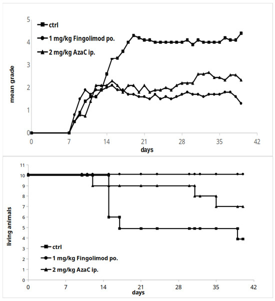 Proof-of-concept experiment showing the efficacy of AzaC. After the first signs of EAE symptoms, mice were randomized and AzaC was administered 3×/week. Because of its low oral bioavailability, the mice received AzaC i.p. The positve comparator was fingolimod applied po. 3×/week. Upper panel: mean EAE clinical grades. Ten mice per group were used. Lower panel: urvival of the mice from the same experiment.