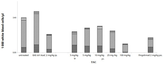 Based on previous clinical data summarized in review papers of the field, the main side effect of both agents—fingolimod [4] and AzaC [28]—is immunosuppression. In our experiments analyzing blood samples obtained from drug-treated mice suffering from EAE, we demonstrated that the myelosuppression caused by the optimal oral TAC dose was not significantly different from the myelosuppression caused by the optimal fingolimod dose, and the decrease in total white blood cell number was not significantly different in the case of the two drugs: mean WBC number ± SD: 1.43 ± 0.97 (fingolimod) vs. 2.12 ± 0.55 (25 mg/kg TAC). The combination treatment with suboptimal doses of TAC and fingolimod resulted in myelosuppression comparable with that caused by the optimal dose of fingolimod: WBC number ± SD: 1.48 ± 0.46 (fingolimod) vs. 1.29 ± 0.51 (combination treatment) (Figure 5 and Table 2).