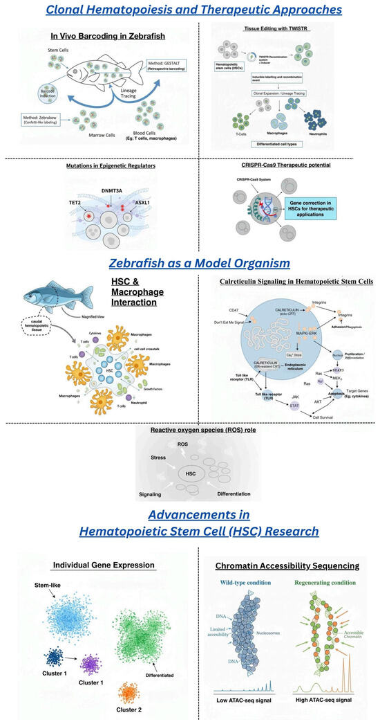 The figure highlights zebrafish as a model for hematopoietic stem cell (HSC) therapy, showcasing key advancements like single-cell RNA sequencing and chromatin accessibility (ATAC-seq). It emphasizes zebrafish’s roles in HSC-macrophage interactions, reactive oxygen species (ROS), and calreticulin signaling. The figure also explores therapeutic approaches, including epigenetic mutations, stem cell tagging (TWISTR), in vivo cellular barcoding, and CRISPR-Cas9 potential.