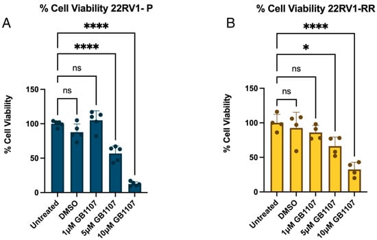 Cell viability was measured using PrestoBlue™ (Thermo Fisher Scientific) following the manufacturer’s protocol. Briefly, 22RV1 parental (22RV1-P) and radioresistant (22RV1-RR) cells were seeded at 5000 cells/well in 96-well plates and incubated for 24 h at 37 °C, 5% CO2. After incubation, cells were treated with GB1107 (1, 5 and 10 µM) dissolved in DMSO or DMSO control for 48 h. PrestoBlue™ (10% v/v) was added and incubated for 1 h, and fluorescence was measured at wavelengths (excitation/emission) of 560 nm/590 nm. Background-corrected values were expressed relative to controls, considering the controls as 100% viability. Data represent at least three independent experiments with five technical replicates. Statistical analysis was performed using one-way ANOVA (p < 0.05).