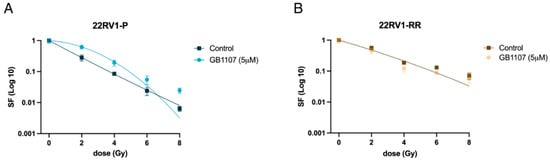 (A) The survival fraction of parental 22RV1 (P) cells, untreated and treated with GB1107 (5 μM), is represented using the linear-quadratic (LQ) model (S = e−(αD+βD2)). p-value < 0.0001. (B) The survival fraction of 22RV1-RR cells, untreated and treated with GB1107 (5 μM), is represented by a single curve using the linear-quadratic (LQ) model (S = e−(αD+βD2)), as no significant difference was observed between the two conditions (p-value = 0.1258); n = 3.