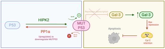 Schematic representation of the molecular interactions between PP1α and p53, and between p53 and Galectin-3 (Gal-3). PP1α directly dephosphorylates p53 at key serine residues, modulating its transcriptional activity and stability. In turn, p53 transcriptionally regulates Gal-3 expression. Created with BioRender.com.