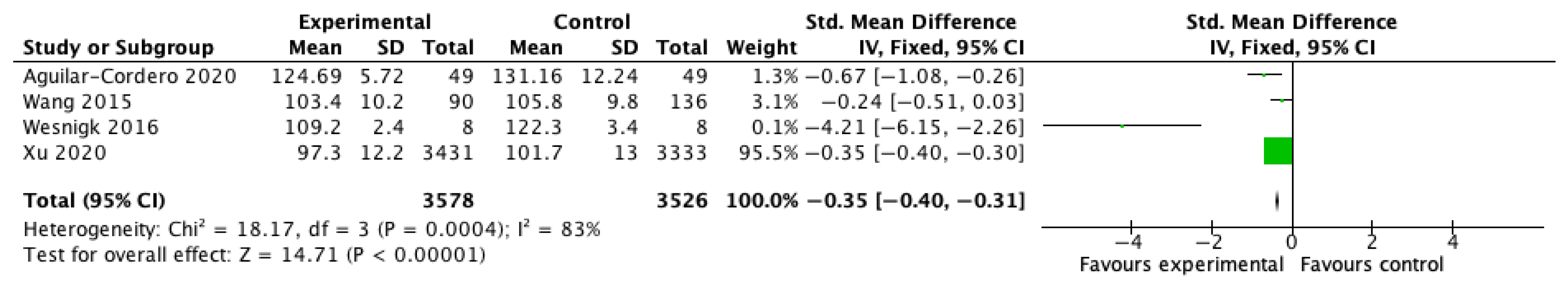 | Systolic blood pressure (SBP) [25,46,48,50] | 4 (RCTs/non-randomized) N = 7104 | Not serious | Serious | Not serious | Not serious | Moderate |