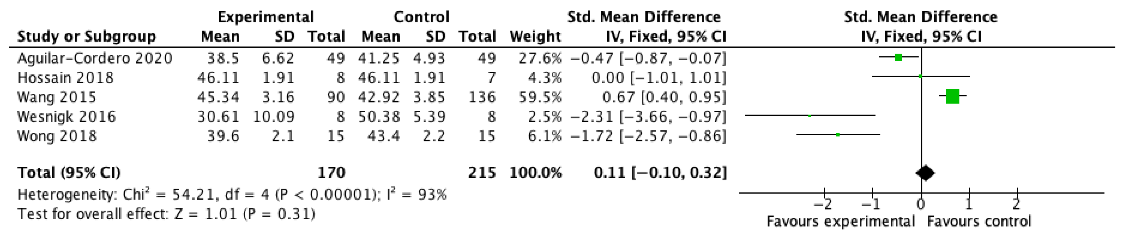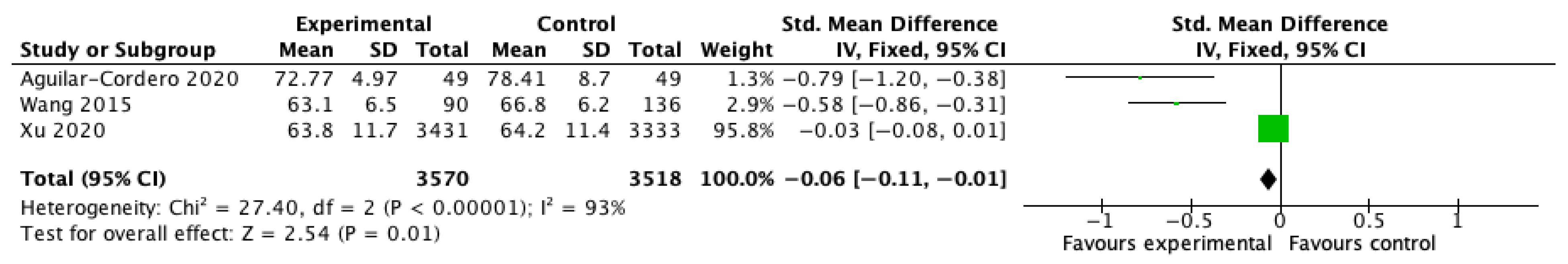 | Cardiorespiratory fitness [31,37,49] | 3 (RCT/quasi) N = 231 | Not serious | Not serious | Not serious | Minor | Moderate |