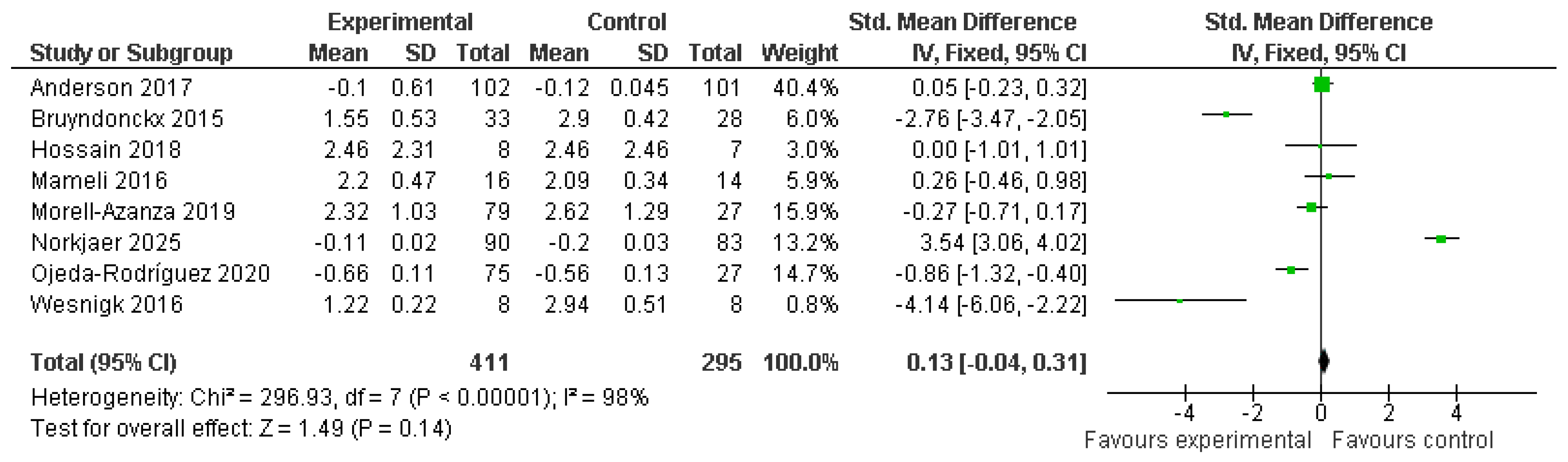 | Body fat percentage (%) [25,29,33,40,45,49] | 6 (RCT/quasi) N = 1299 | Not serious | Very serious | Not serious | Serious | Low |
