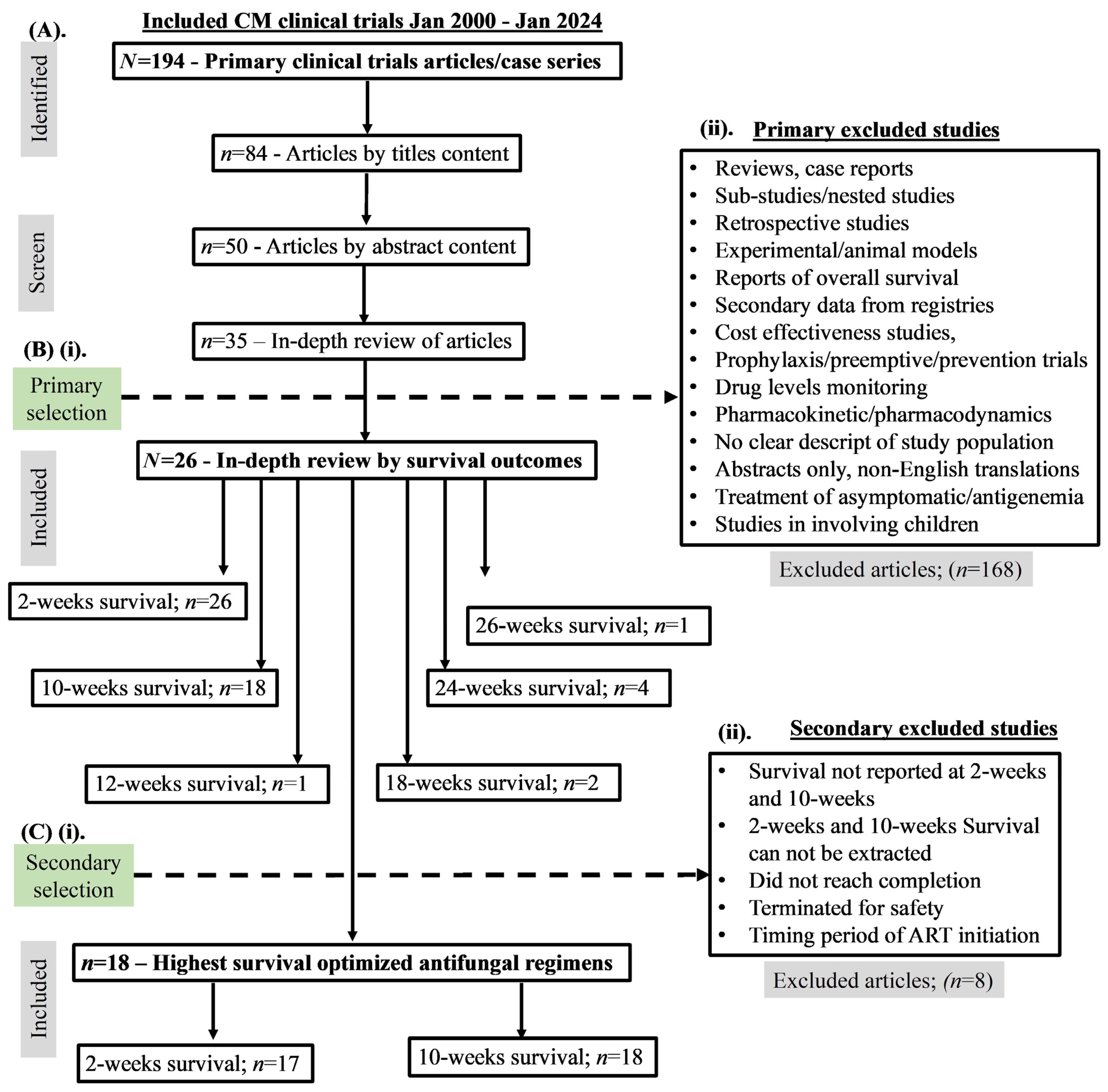 | Boulware (2023) [33] | All—oral AmB nanocrystals | 40 | 34 (85%) | 41 ** | 35 (85.4%) |