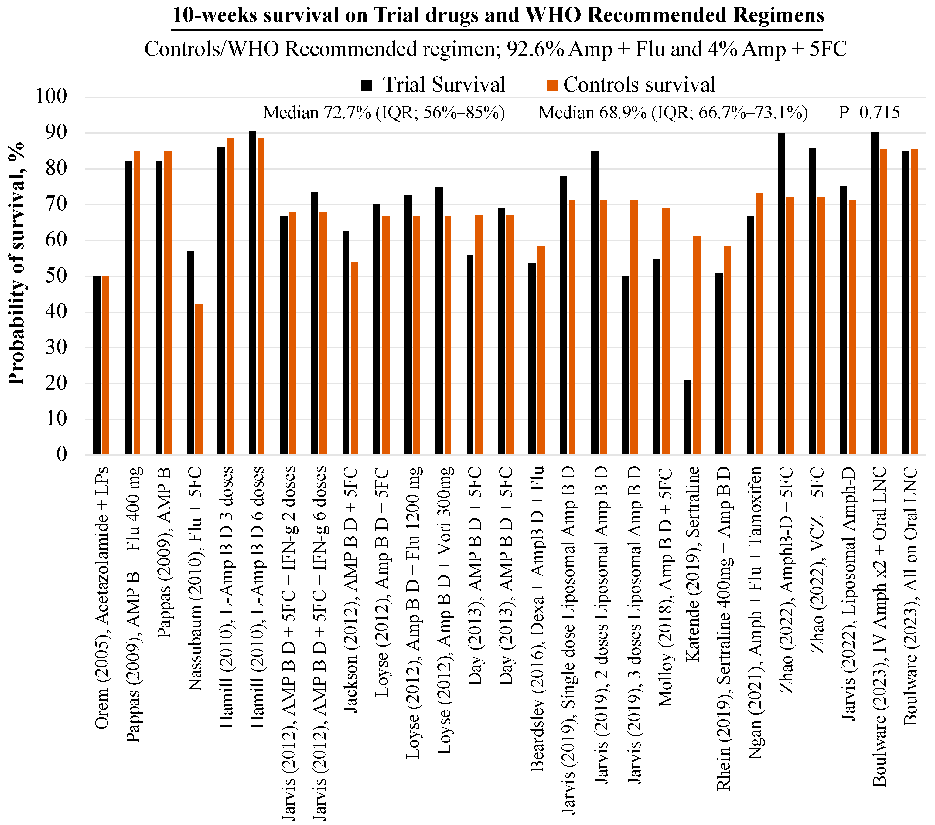 | Jarvis, (2019) [29] | 2 doses L-AmB + fluconazole | 20 | 17 (85%) | 21 | 15 (71.4%) |