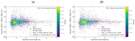 Sensitivity of the deviation of the FLS wind speed from the cup wind speed to a significant wave height Only the samples of the 10 min wind speed over 2 m/s are used. Deviation is expressed as a value relative to the cup wind speed. The rectangles indicate averages of the deviation for wind speed bins of a 0.2 m width, and valid values are indicated in red. The gray and red lines indicate regression lines for raw samples and valid bin averages, respectively. The average and standard deviation of the significant wave height are also presented in the figures. (a) FZX, (b) AZX, (c) AWC, and (d) MDB.