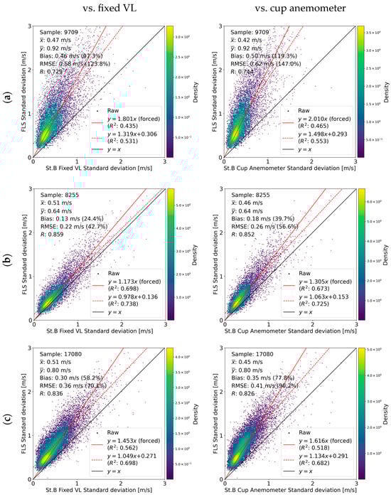 When discussing the capability of the FLS in terms of capturing the turbulence component, it is important to consider that the error derived from the FLS measurement can be categorized into two main factors. One factor is the buoy motion, which generates a false turbulence component in every raw measurement. This effect was confirmed to be almost negligible in the case of the 10 min averaged wind speed, as in the previous section, but it cannot be overlooked in the case of the SD. The other factor is the measurement principle of the VL, i.e., the volume measurement. The VL (irrespective of being mounted on an FLS or fixed platform) assumes homogeneity in the wind flow in the measurement volume and measures the wind speed as the volume average (in contrast to a conventional cup anemometer, which measures the wind speed at a point). Thus, the VL-measured turbulence is inherently different from that measured using a cup anemometer [21,22,23,24]. Therefore, the FLS-measured SD and TI must be verified against both the fixed VL and cup anemometers.