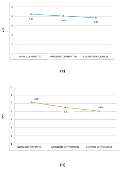As shown in Figure 2a,b, the presence of dehydration was associated with ADL (p ≤ 0.001) and IADL (p ≤ 0.001) scores, but was independently associated with the ESS (p = 0.54), as shown in Figure 2c. Moreover, the dehydration risk was independently associated with age (r2 = 0.0046, p = 0.77), and MNA (r2 = 0.0004, p = 0.48), as shown in Figure 2d,e, respectively.