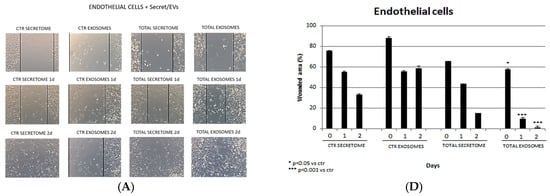 Wound-healing assay on (A) endothelial cells, (B) fibroblasts, and (C) osteoblasts (20× magnification). In the first two columns, the controls (secretome and exosomes) are shown. In the second two columns, total secretome and isolated exosomes added to the cell specific culture media are shown. Percentage of the wounded area on (D) endothelial cells, (E) fibroblasts, and (F) osteoblasts at 0, 1, and 2 days.