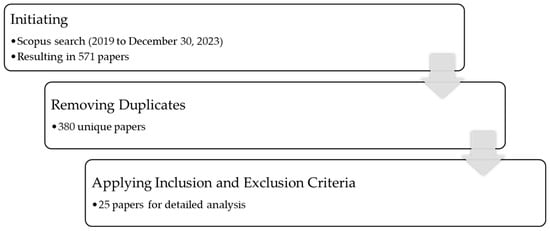 For the literature review, a systematic search was conducted on Scopus, spanning the period from 2019 to 30 December 2023. The search focused on the intersection of cybersecurity, awareness, and training, employing three specific queries: (1) “Cybersecurity (Title) AND awareness AND training (Title, Abstract, Keywords)”, yielding 215 papers; (2) “Cybersecurity (Title) AND awareness AND learning (Title, Abstract, Keywords)”, resulting in 167 papers; and (3) “Cybersecurity (Title) AND awareness AND education (Title, Abstract, Keywords)”, producing 189 papers. These searches aimed to comprehensively cover literature related to cybersecurity awareness, including different aspects.
