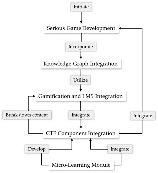 Proven elements from popular cybersecurity awareness frameworks are seamlessly integrated into the Integrated Cybersecurity Awareness Training (iCAT) framework. Each integrated component adds a special dimension to create a thorough and productive training environment. The iCAT framework’s integrated design process is depicted in Figure 2, which combines gamification, knowledge graph utilization, serious game development, CTF component, and micro-learning modules into a unified cybersecurity awareness training method. Figure 2 illustrates how these elements work together to form a training system that is coherent. The adaptive learning paths ensure that training is personalized to individual learners’ pace and comprehension. In contrast, user-centric accessibility ensures that all users, regardless of their technical proficiency, can benefit from the training.