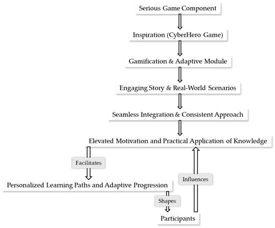 There are numerous advantages to the Serious Game Component of iCAT. Embedded gamification components raise motivation and participation and guarantee that participants stay interested over time. Reinforcing learning outcomes, the practical application of information in real-world circumstances bridges the gap between theory and practice. Furthermore, because the game is adaptive, players can advance at their own speed and create customized learning routes based on their ability levels. The Serious Game Component of the iCAT Framework is used in an integrated and useful way to improve participant engagement and individualized learning, as shown in Figure 3. This diverges into Engaging Story and Real-World Scenarios and Gamification and Adaptive Module before coming together at Seamless Integration and Consistent Approach. With an arrow looping back to the core box, this central element relates to Shapes Participants, Personalized Learning Paths, Adaptive Progression, and Elevated Motivation and Practical Application of Knowledge. This demonstrates how various components work together to produce a flexible and interesting learning environment.