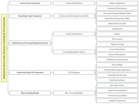 Separately proven components are combined in the iCAT framework to produce a complete and successful cybersecurity training program. The iCAT framework includes a Serious Game Component, Knowledge Graph Component, gamification and learning management system, CTF Component, and micro-learning module. Every element adds special advantages to the framework, improving participants’ learning results and participation (Figure 6). This integrated approach aims to enhance both practical skills and theoretical understanding, making cybersecurity training more effective and engaging. To improve comprehension, the Knowledge Graph Component uses methods like named entity recognition and relation extraction to organize and structure cybersecurity knowledge. To encourage and involve students, the gamification and learning management system component has features like leaderboards, badges, and point systems. The CTF Component offers real-time feedback, competitive challenges in a practical setting, and an environment that encourages the application of theoretical knowledge. The multifaceted approach not only addresses the urgent need for enhanced cybersecurity awareness, but also fosters a more profound comprehension of intricate concepts, thereby equipping individuals to more effectively navigate the changing digital landscape [,].