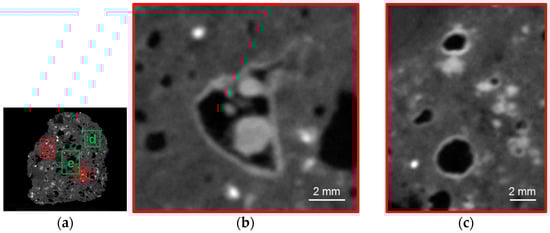 (a) Slice of the X-ray volume of the impactite where the green frames highlight the presence of evaporites and in the red frames show corrosion layers covering inner vesicles; (b) detail of a large vesicle covered by the corrosion layer and the residua of corroded iron spherules; (c) close-up detail of two large and three small vesicles covered by the corrosion layer; (d) close-up detail of the top-right evaporite; (e) close-up detail of the evaporite filling the large central vesicle.