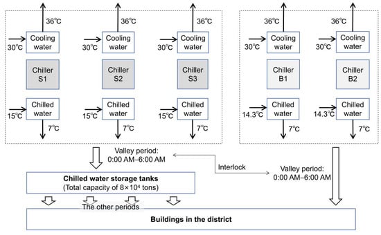 - During the valley period with low electric power consumption (typically from 0:00 AM to 6:00 AM), chillers S1–S3 generate the chilled water using the low-price electricity from the power grid and then transport the chilled water into storage tanks. Two base load chillers B1 and B2 keep operating simultaneously to meet fundamental cooling demand.