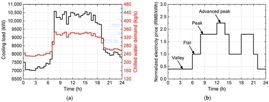 The Shanghai government has implemented the time-of-use electricity price policy as shown in Figure 2b [3]. The electricity price fluctuates with the change in different types of time periods. The designed operation strategy mentioned in Section 2 intends to only use low-price electricity in the valley period for chilled water generation and storage, avoiding electricity consumption during the other periods, especially the peak and advanced peak periods.