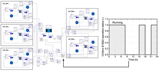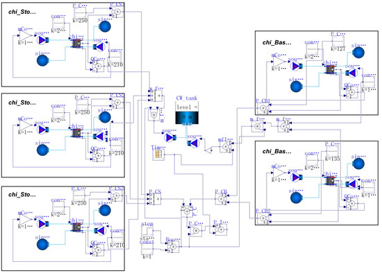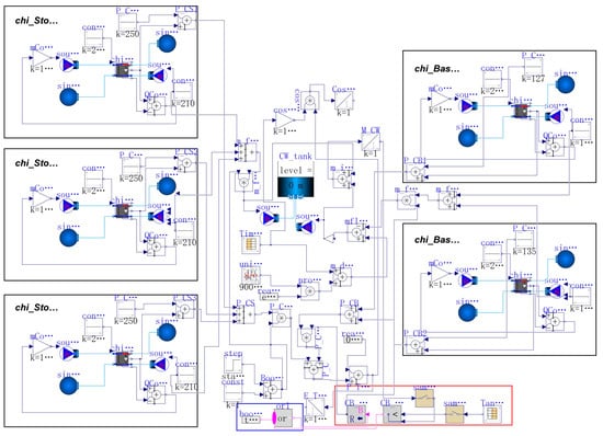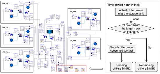 As mentioned in Section 5.3, considering that the time required for base load chillers’ restart is about 10 min, the minimal time interval between the two adjacent adjustments to chillers operation status was also 10 min in the adaptive operation strategy, thus causing the above time-lagging problem when tracking the target curve. However, the base load chillers were closed for hours before their last restart at around 9:00 PM, indicating that the restart time interval limit could be ignored here. Therefore, in order to prevent the time lag and too early exhaustion of the stored chilled water before 12:00 PM, a slight modification was applied to the adaptive operation strategy, which was to force the base load chillers to operate at once after 9:00 PM. The modified strategy then was implemented into the OpenModelica system model by using the relevant blocks shown in the blue box in Figure 13.