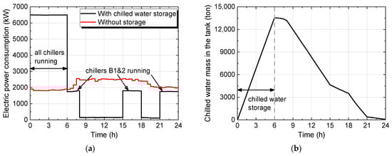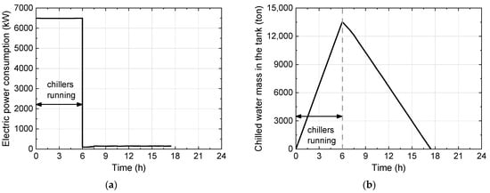 Simulation results of the system with the newly designed operation strategy: (a) Electric power consumption of the system. (b) Chilled water mass in the storage tank.