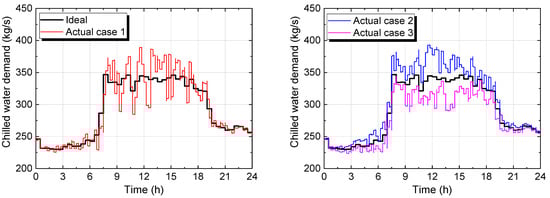 Although the newly designed operation strategy proved feasible to meet the given ideal cooling demand in Figure 2a, its adaptability still needs further evaluation for commercial operation applications due to the existence of deviations between the actual real-time cooling demand and the statistically averaged ideal demand. Figure 7 shows three representative cases of the actual cooling demand fluctuations:
