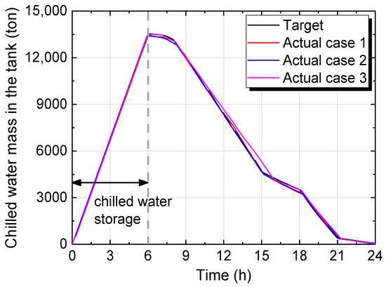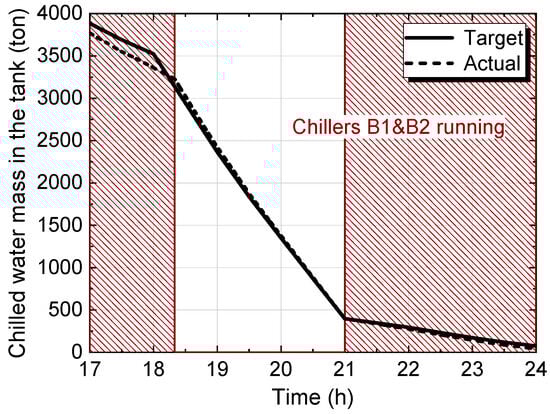 As seen in Figure 9, by implementing the adaptive operation strategy, the actual chilled water mass in the storage tank could closely track the target curve calculated under ideal cooling demand conditions (in Figure 6b). The tracking of the target curve was realized by adaptive adjustments to the base load chillers’ operation states according to actual cooling demand characteristics: