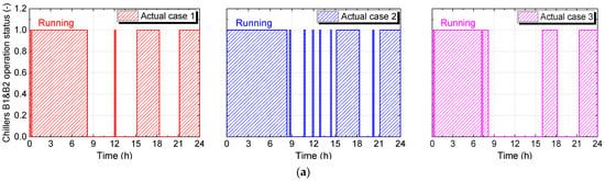 - In case 1 of the actual cooling demand (in Figure 7), the temporal distribution of the transient cooling demand changes, but the daily total demand is nearly unchanged. Thus, as shown in Figure 10a, the daily total operation time of base load chillers in case 1 is 14.2 h, which is almost the same as the 14 h by implementing the designed operation strategy in Figure 5. However, the operation time period slightly changes as an additional operation at around 12:00 AM occurs due to the cooling demand fluctuation.