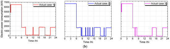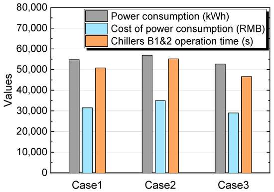 - In case 2 and case 3, there is an overall rise or drop in the actual cooling demand, resulting in the corresponding variations in the total operation time of base load chillers, as shown in Figure 10a. The total operation time of base load chillers increases to 15.33 h in case 2 and it decreases to 12.67 h in case 3. The cooling system electricity consumption in Figure 10b varies with the base load chillers’ operation states as the electricity consumption rises in the operation time periods of chillers B1 and B2.
