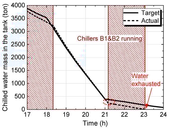 In order to solve the problem above, the simulation results of a failed numerical test case were used for analysis as plotted in Figure 12. As discussed before for the newly designed operation strategy in Section 5.2, the base load chillers only operate in the valley and flat periods to avoid the powder grid’s electricity load peaks. Thus, the cooling demand during the peak period of 6:00 PM–9:00 PM is just carried by the stored chilled water, and the target chilled water mass in the storage tank drops quickly. The actual stored water mass then becomes larger than the rapidly decreasing target mass, resulting in a similar decrease in actual stored chilled water mass when tracking the target curve. However, because of the delay during the parameter tracking using the adaptive strategy, there still exists a continuous rapid decrease in actual stored water mass for a short period after 9:00 PM, even though the target value has already dropped slower, as indicated by the red circle in Figure 12, thereby making the amount of the actual stored chilled water unable to meet the remaining cooling demand. In summary, the failures of the adaptive operation strategy were caused by the strategy’s time-lagging feature.