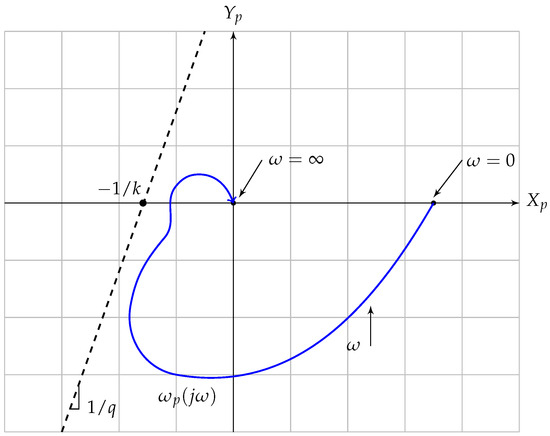 Notice that by taking , the resulting point on the “Popov plot” is , and for , the point on the “Popov plot” is . Between these points, the transfer function is continuous and is shaped like a quarter of a circle. By the geometric interpretation of (2), it is sufficient to find a straight line, with a slope of that intersects the x-axis at , and is located strictly to the left of the plot of the “Popov plot” of the transfer function. In this case, it is clear that for every choice of a positive slope, the “Popov plot” of the transfer function will be strictly to the right of this straight line, in particular for the value of . Consequently, if condition (7) holds, then there exist and a small positive constant such that (2) holds, meaning that the equilibrium is globally asymptotically stable, as desired. □