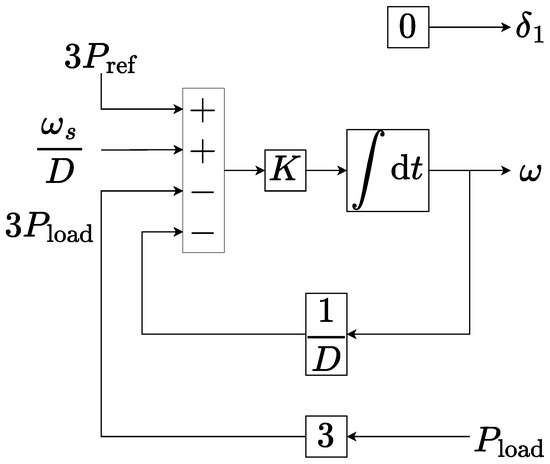 where represents the moment of inertia of the rotor, is the electrical frequency of the rotor, stands for the damping coefficient, and without loss of generality, represents the reference power, where is the nominal angular velocity. The power consumed by the load is a general non-linear function of the electrical angular frequency . For the system (4), there is at least one equilibrium point located at . It is trivial to verify that linearizing (4) in a small neighborhood of the equilibrium point leads to