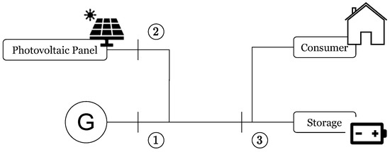 System model consisting of three buses, bumered 1–3. A generator is connected to bus number 1, a PV is connected to bus number 2, feeding a non-linear load that includes a storage device, both connected to bus number 3.