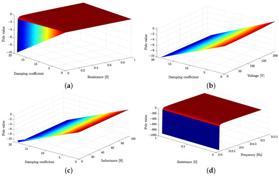 Root-locus for changing parameters. (a) Root-locus for changing values of damping coefficient and resistance. (b) Root-locus for changing values of damping coefficient and voltage. (c) Root-locus for changing values of damping coefficient and inductance. (d) Root-locus for changing values of resistive load and frequency fluctuations.