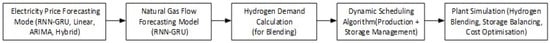 Plant simulation results confirmed that accurate forecasting significantly enhances operational outcomes, reducing production costs, improving storage utilisation, and reliably meeting hydrogen blending requirements. Weighted hybrid forecasting strategies for electricity prices, coupled with GRU-based gas demand predictions, delivered the most cost-effective and resilient operational profiles across the December 2023 validation period.