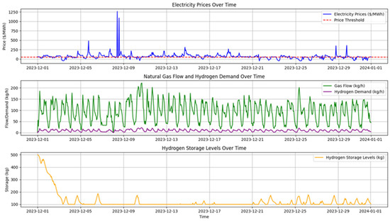Figure 2 illustrates the dynamic behaviour of electricity pricing, natural gas flow demand, and hydrogen storage levels across the December 2023 validation period. The alignment of production and storage activities with market fluctuations demonstrates the effectiveness of the predictive scheduling framework.