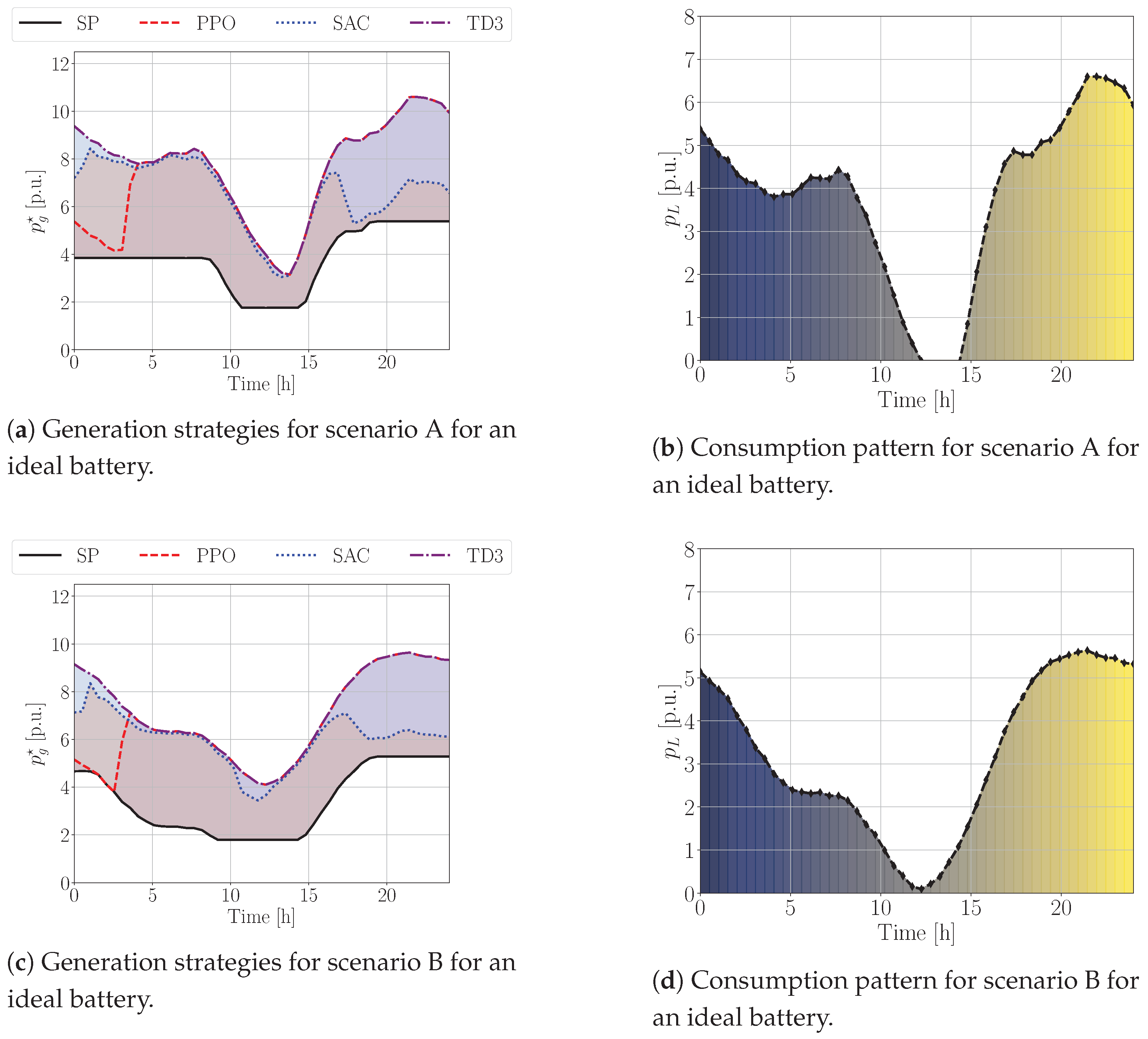 17], serves as a crucial baseline. In this study, we develop a systematic approach to tackle this problem using reinforcement learning methods. These RL techniques operate with incomplete information regarding the system’s model dynamics. A key objective here is to meticulously demonstrate and quantify the effects of this missing knowledge on the operational results, especially when contrasted with traditional optimal control methods that presume and operate with complete, deterministic knowledge of both the system model and all relevant signals, such as load and generation profiles. This initial, simplified case is fundamental for understanding the performance degradation that might occur when relying on data-driven approaches under ideal conditions where optimal control is expected to excel.