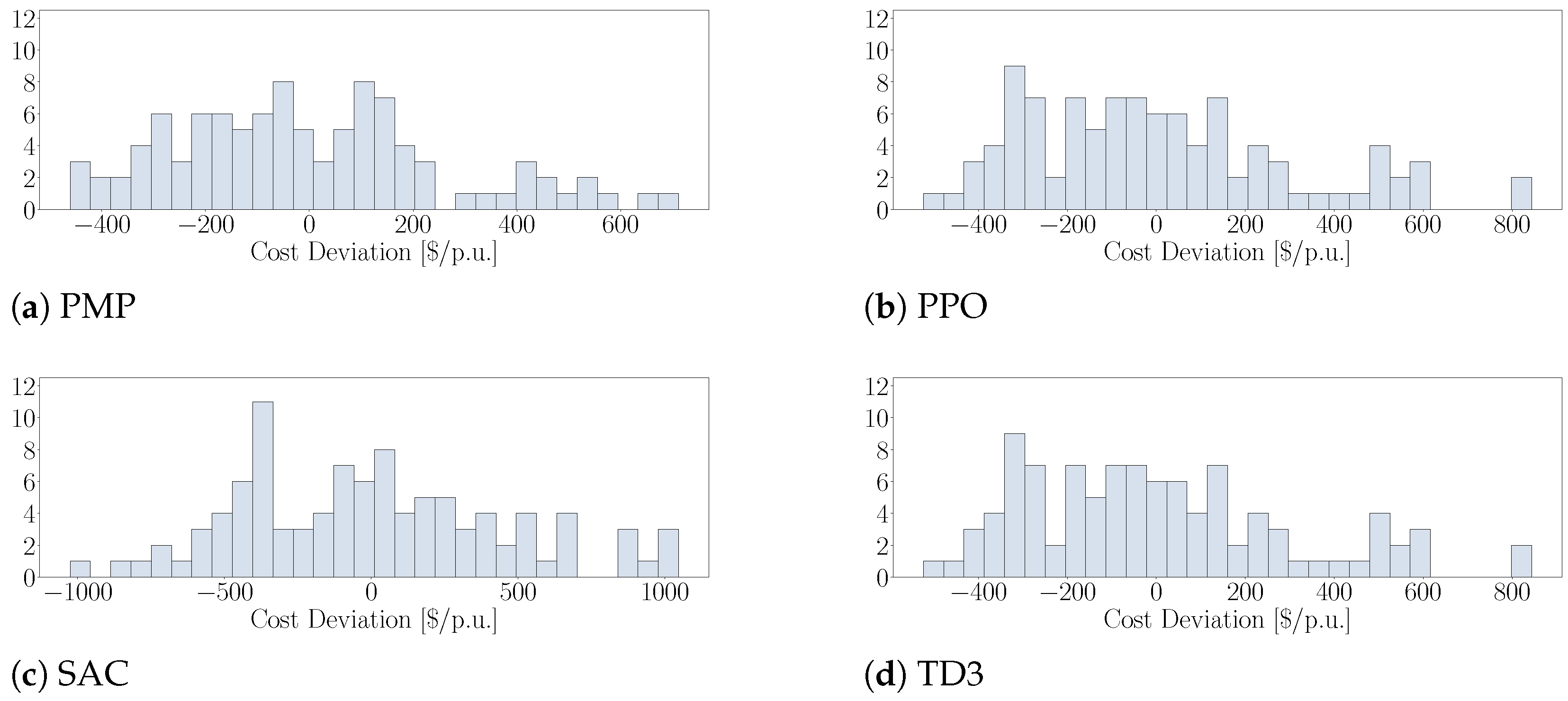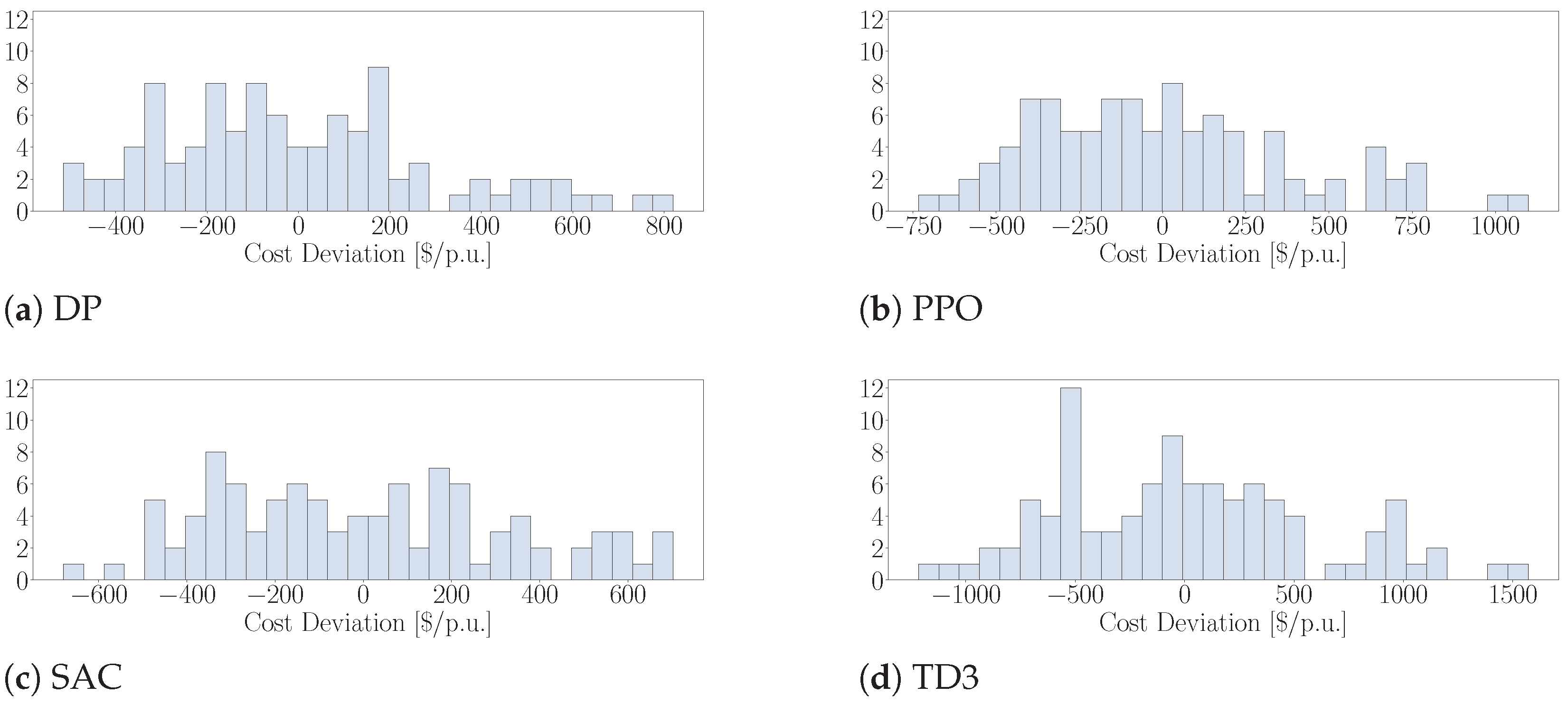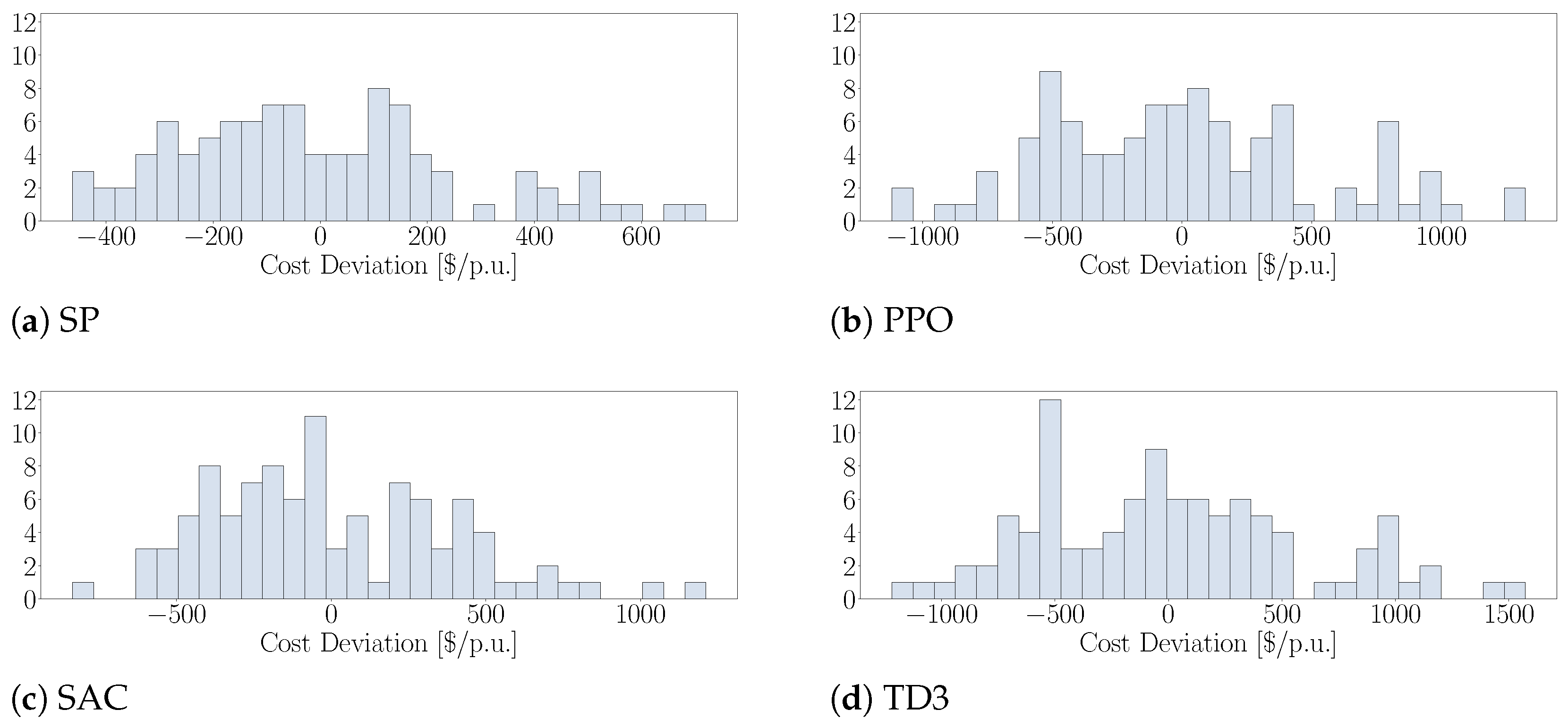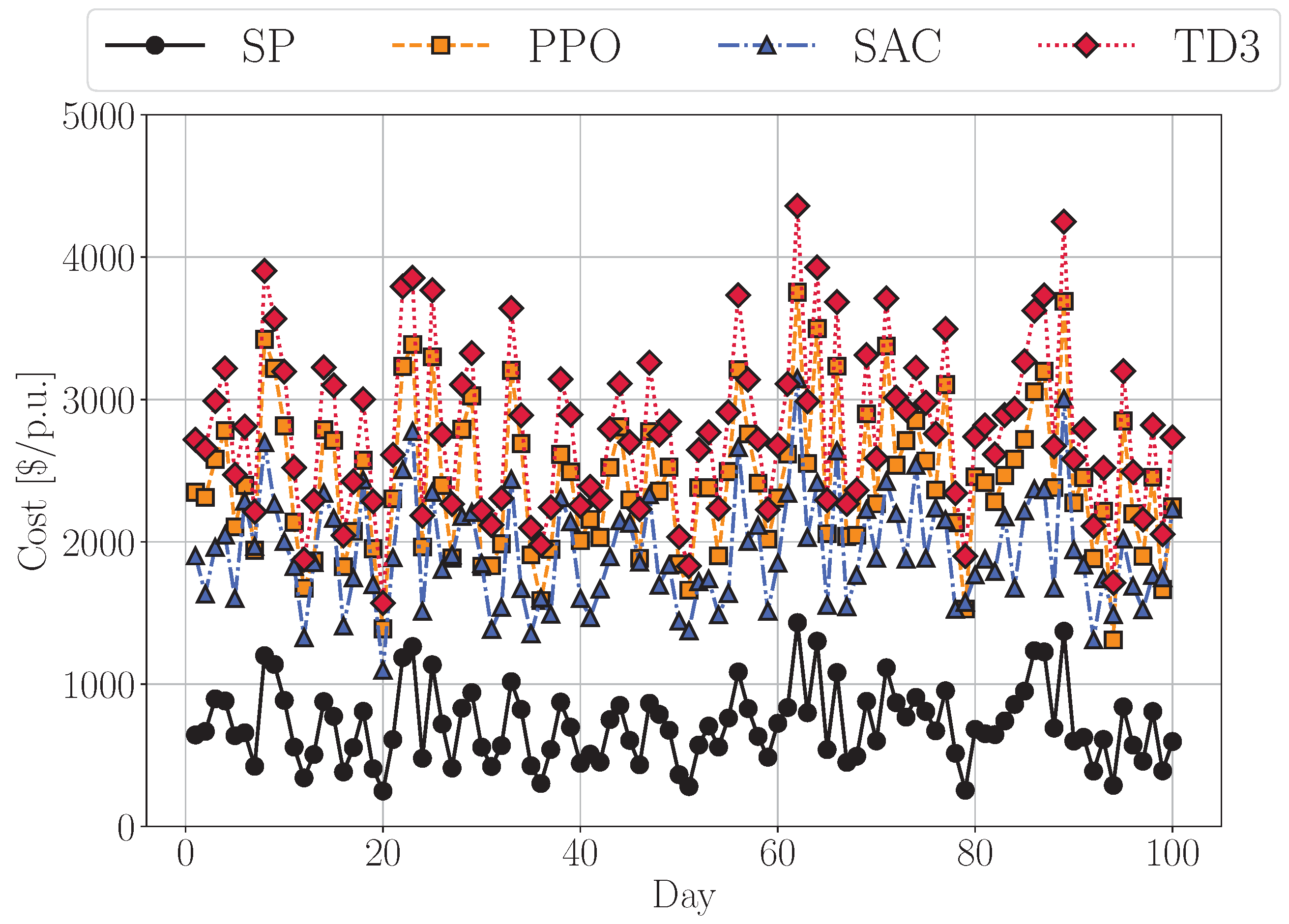 USD/p.u. Moreover, the model-free RL approaches exhibited greater variance compared to the SP method. The cost deviations depicted in