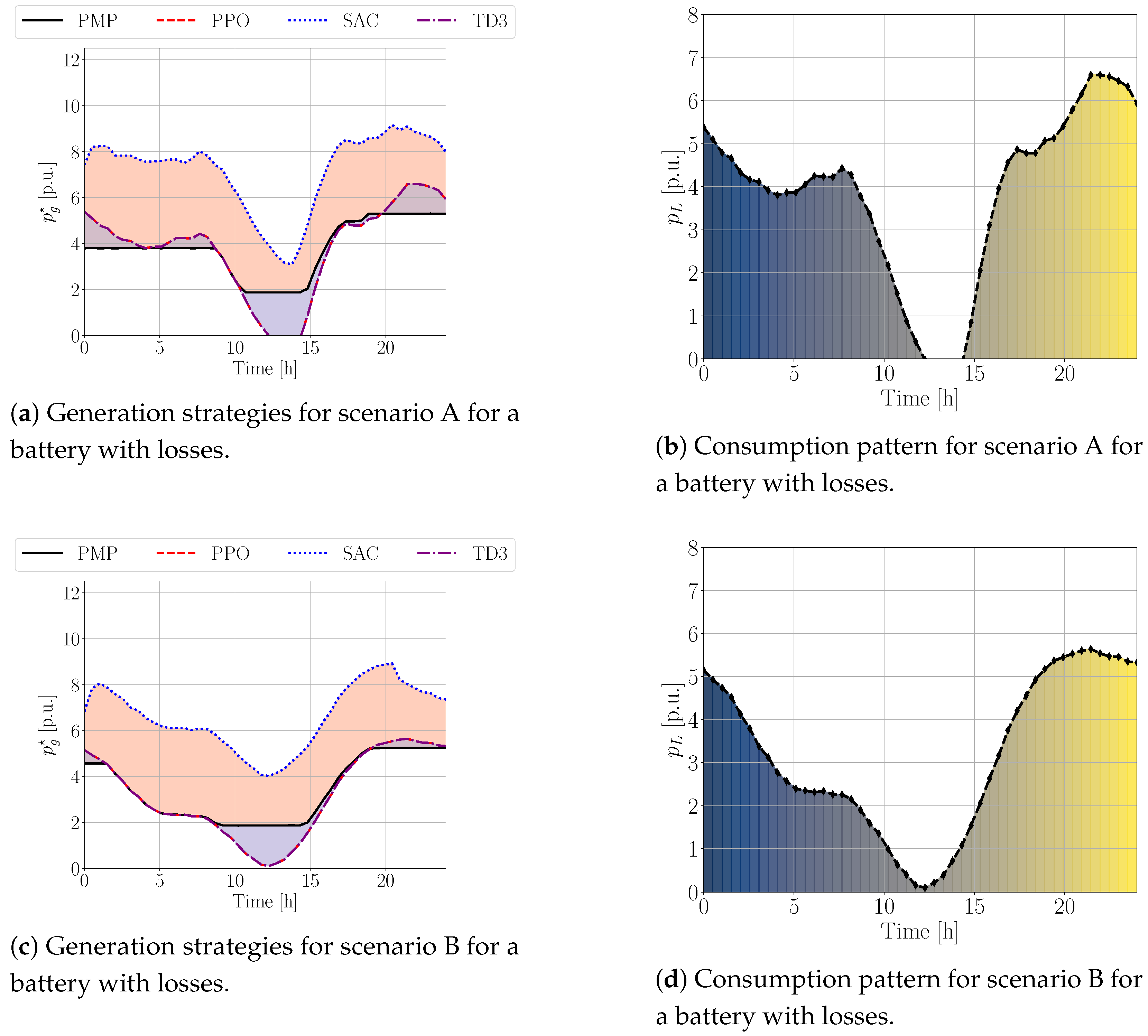 when applying PMP. This reflects the added difficulty posed by the transmission losses even for the optimal control approach. However, for all RL algorithms, there was a general trend of performance improvement relative to their own baseline in the ideal case, but a degradation compared to the lossy-storage case for PPO and SAC, while TD3 remained poor. This suggests that while RL can handle some forms of uncertainty, the nature and location of that uncertainty, whether it is internal, and is captured by the model, or external to the modeled MDP, significantly impacts its effectiveness.