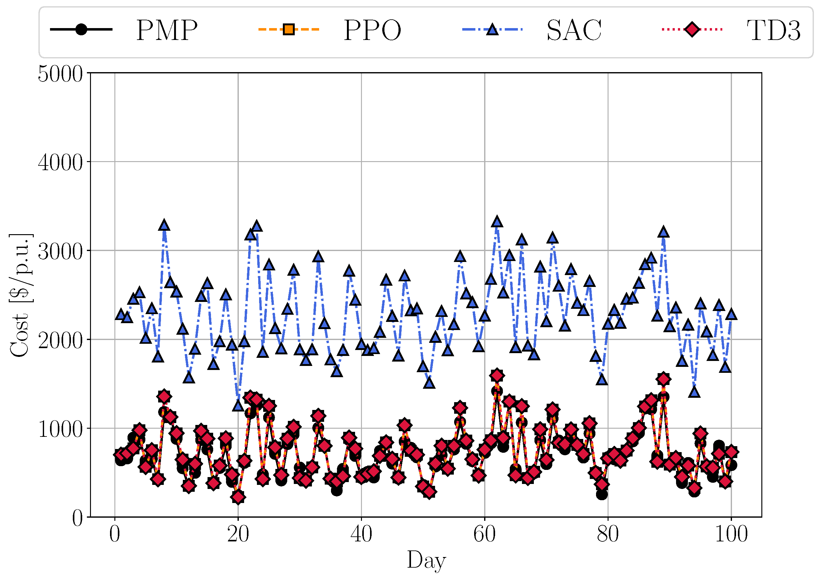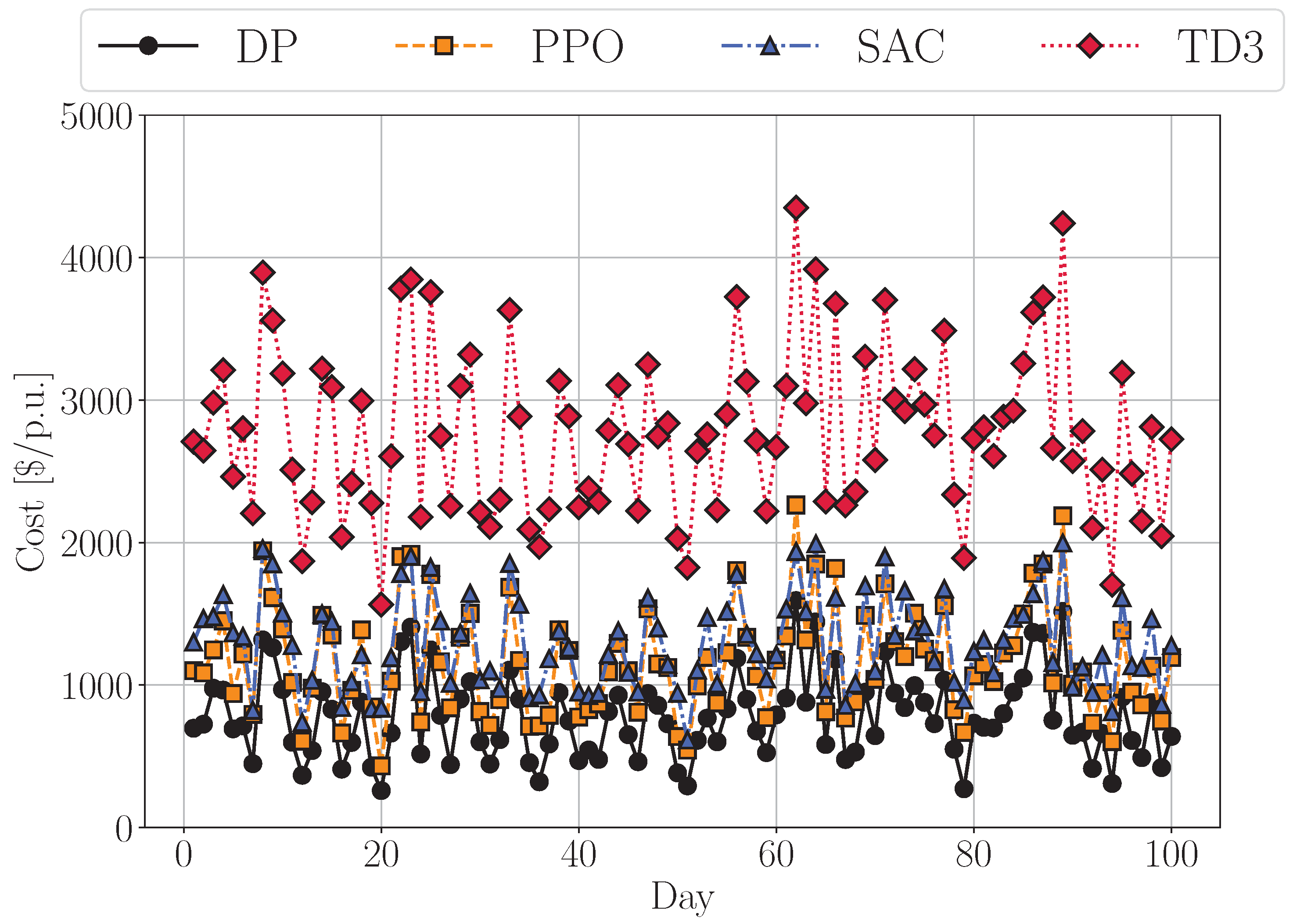 USD/p.u. Remarkably, both PPO and TD3 achieved mean costs of