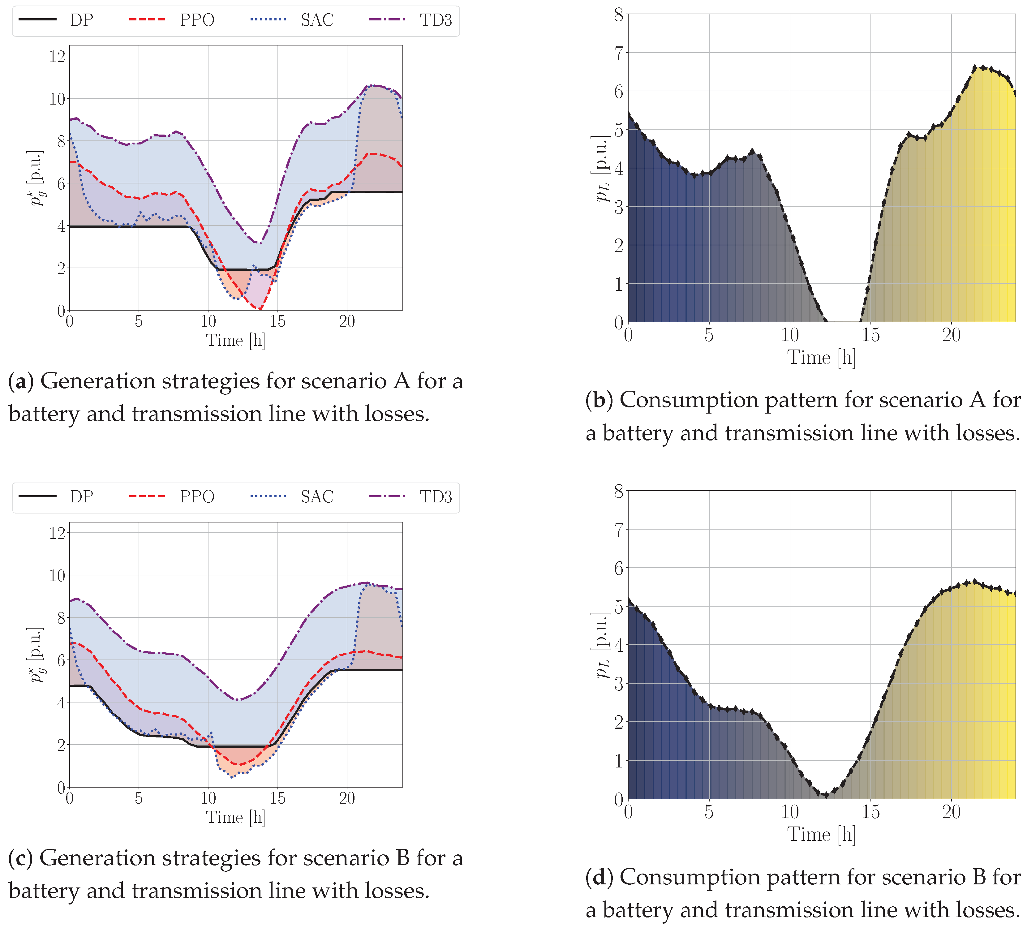 USD/p.u. for TD3. This may be atributed to the improvement to their inherent ability to navigate and learn within large and complex state spaces, allowing them to capture some of the nuances of the lossy environment more effectively than they did in the simpler ideal environment where their learning seemed less focused. However, it is also crucial to note that the introduction of model complexity in the form of losses led to an increase in the variance of the daily costs for all RL algorithms.