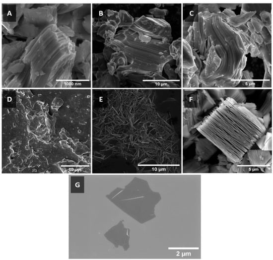 SEM micrographs of (A) Mo2TiAlC2, (B) V2AlC, (C) Ti3AlC2 MAX phases and (D) Mo2TiC2Tx, (E) V2CTx, (F) multi-layer Ti3C2Tx (ML-Ti3C2Tx), (G) Ti3C2Tx MXenes.