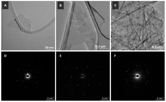 TEM micrographs of (A) Mo2TiC2Tx, (B) Ti3C2Tx and (C) V2CTx MXenes. Images (D–F) are selected area electron diffraction (SAED) patterns of (A–C), respectively.