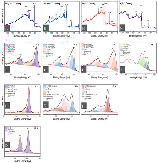 To determine the chemical composition of the MXenes, especially to determine the nature of the surface moieties, XPS was utilised. The resulting XPS data can be observed in Figure 3, where Mo2TiC2Tx survey and core-level scans are seen in Figure 3A–D, ML-Ti3C2Tx in Figure 3E–G, Ti3C2Tx in Figure 3H–J and V2CTx in Figure 3K,L. From the survey scans, we can develop a general idea of the elemental (atomic) composition of the as-synthesised MXenes. When analysing this data, we will omit carbon contributions due to the high chance of adventitious carbon contamination. When normalised against Mo (3d), in Mo2TiC2Tx, we obtain an atomic percentage ratio of 1:0.3:0.64:0.05 for Mo:Ti:O:F.