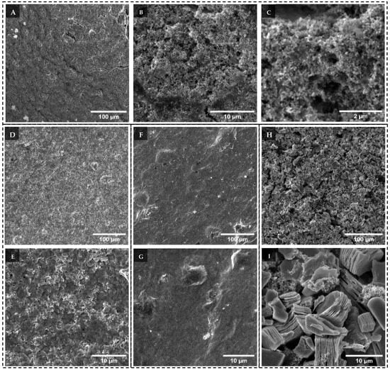 SEM micrographs of (A) V2CTx electrodes at low, (B) intermediate and (C) high magnifications; (D) Mo2TiC2Tx electrodes at low and (E) intermediate magnifications; (F) Ti3C2Tx electrodes at low and (G) intermediate magnifications; (H) ML-Ti3C2Tx at low and (I) intermediate magnifications.