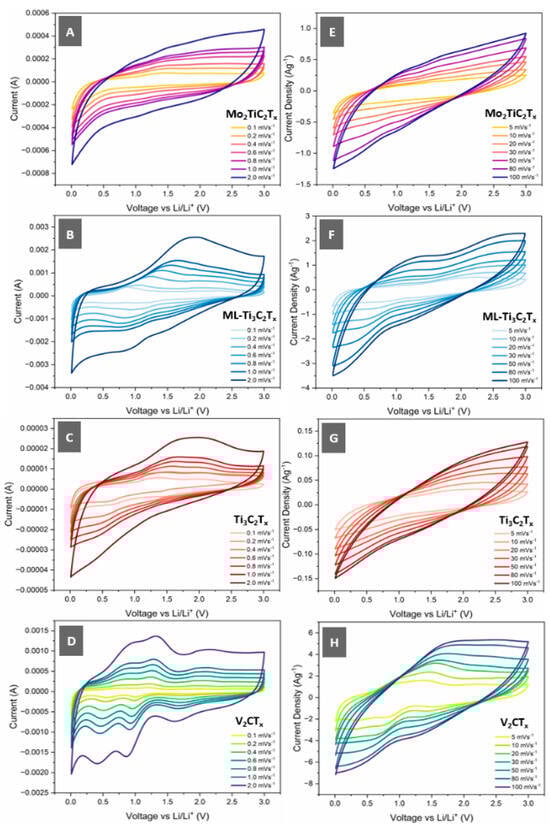 Cyclic voltammetry (CV) of Mo2TiC2Tx (A), ML-Ti3C2Tx (B), Ti3C2Tx (C) and V2CTx (D) MXene electrodes between the scan ranges of 0.1–2.0 mVs−1 and (E–H) 5–100 mVs−1 between the voltage range of 0.01 V to 3.0 V in lithium half-cells (coin).