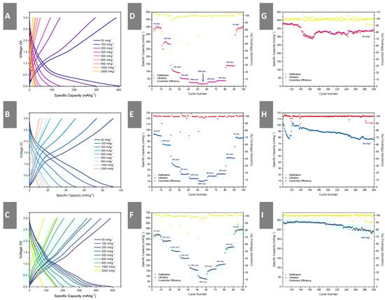 Galvanostatic plots demonstrating the voltage profiles (A–C), rate performance (D–F) and cycling stability (G–I) of Mo2TiC2Tx, ML-Ti3C2Tx and V2CTx, respectively, under galvanostatic charge and discharge cycles.